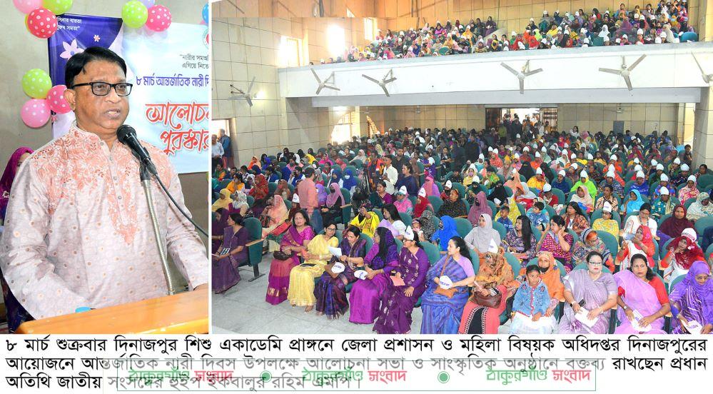 ৮ মার্চ শুক্রবার দিনাজপুর শিশু একাডেমি মিলনায়তনে দিনাজপুর জেলা প্রশাসন ও মহিলা বিষয়ক অধিদপ্তর দিনাজপুরের আয়োজনে আন্তর্জাতিক নারী দিবস উপলক্ষে আলোচনা সভা ও সাংস্কৃতিক অনুষ্ঠানে প্রধান অতিথির বক্তব্যে জাতীয় সংসদের হুইপ ইকবালুর রহিম এমপি এসব কথা বলেন। এবারে নারী দিবসের প্রতিপাদ্য বিষয় ছিল “নারীর সমঅধিকার,সমসুযোগ এগিয়ে নিতে হোক বিনিয়োগ”।