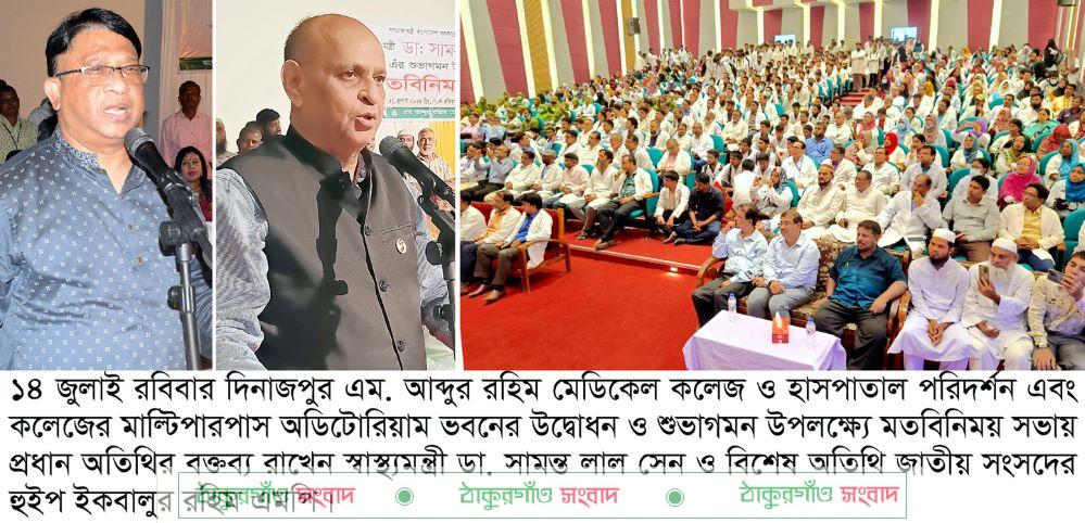 রবিবার দিনাজপুর এম. আব্দুর রহিম মেডিকেল কলেজ ও হাসপাতাল পরিদর্শন এবং কলেজের মাল্টিপারপাস অডিটোরিয়াম ভবনের উদ্বোধন, কলেজের আয়োজনে অডিটোরিয়ামে শুভাগমন উপলক্ষ্যে মতবিনিময় সভায় প্রধান অতিথির বক্তব্যে তিনি এসব কথা বলেন। বিশেষ অতিথির বক্তব্য রাখেন জাতীয় সংসদের হুইপ ইকবালুর রহিম। পরে এম আব্দুর রহিম মেডিকেল কলেজ হাসপাতাল পরিদর্শন শেষে গণমাধ্যম কর্মীদের সাথে কথা বলেন মন্ত্রী।
