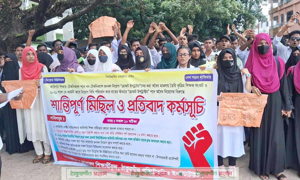“ডিপ্লোমা ইঞ্জিনিয়ার, দেশ গড়ার হাতিয়ার” এই শ্লোগানে ঠাকুরগাঁও পলিটেকনিক ইনস্টিটিউটের সাধারণ শিক্ষার্থীদের আয়োজনে শান্তিপুর্ন মিছিল নিয়ে ঠাকুরগাঁও জেলা প্রশাসকের কার্যালয়ের সামনে এসে প্রতিবাদ কর্মসূচীতে অংশ নেন মো: আব্দুস সালাম, মো: জুবায়ের হোসেন, মো: জাকির হোসেন, মো: মুস্তাকিম, মো: রকি, আরিফ ফয়সাল, মো: আবু সাঈদ, আলনাউন, মদিনাসহ শিক্ষার্থীগণ। ৬ দফা দাবিগুলো হলো-কারিগরি সেক্টর পরিচালনায় কারিগরি শিক্ষা বহি:র্ভুত কোন জনবল থাকতে পারবে না, ডিপ্লোমা ইঞ্জিনিয়ারিং কোর্স ৪ বছর মেয়াদী করতে হবে এবং প্রতি সেমিষ্টার পূর্ন মেয়াদের (৬ মাস) করা, ২০২১ সালের বিতর্কিত নিয়োগ প্রাপ্ত সকল ক্রাফট ইন্সট্রাক্টরদের কারিগরি অধিদপ্তর এবং সকল প্রতিষ্ঠান থেকে দ্রুত অপসারণ, কারিগরি সেক্টরে সকল শুণ্য পদে কারিগরি জনবল নিয়োগ দ্রুত সম্পুর্ণ করা, কারিগরি শিক্ষা অধিদপ্তরের সকল নিয়োগ বিধিমালা সংশোধন করা, উপ-সহকারী প্রকৌশলী (১০ম) গ্রেড পদে ডিপ্লোমা ইন-ইঞ্জিনিয়ার ব্যাতিত অন্য কেউ আবেদন করতে পারবে না; উপ-সহকারী প্রকৌশলী ও সমমান পদ ডিপ্লোমা ইন ইঞ্জিনিয়ারদের জন্য সংরক্ষিত রাখার দাবি।