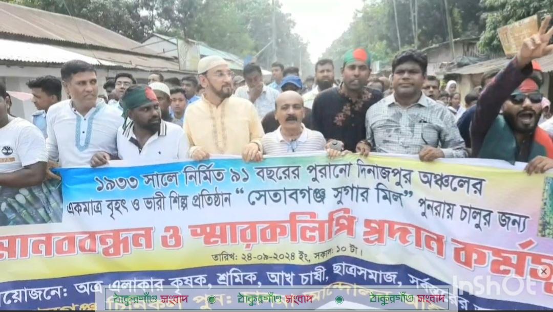 মোঃ শামসুল আলম, বোচাগঞ্জ (দিনাজপুর) প্রতিনিধি\ দিনাজপুর জেলার একমাত্র ভারী শিল্প প্রতিষ্ঠান সেতাবগঞ্জ চিনিকল পূনরায় চালু করার দাবিতে মঙ্গলবার চিনিকলের প্রধান ফটকের সামনে মানববন্ধন ও পথ সভা করেছে শ্রমিক কর্মচারী, আখচাষী ও সর্বস্তরের ছাত্র জনতা। সেতাবগঞ্জ চিনিকল পুন চালনা আন্দোলন, আহবায়ক কমিটি আয়োজিত এ পথ সভায় বক্তব্য রাখেন চিনিকলের ব্যবস্থাপনা পরিচালক আবুল বাশার, দিনাজপুর জেলা বিএনপির সদস্য মোঃ সাদিক রিয়াজ ছৌধুরী পিনাক, উপজেলা বিএনপির সাধারণ সম্পাদক সাবেক ভিপি মোঃ সফিকুল আলম, হাজী মোহাম্মদ দানেশ বিজ্ঞান ও প্রযুক্তি বিশ^ বিদ্যালয়ের ছাত্র বৈষম্যবিরোধী ছাত্র আন্দোলনের অন্যতম সমন্বয়ক মোঃ ফয়সাল মোস্তাক, আখচাষী যথাক্রমে মোঃ ফারুক আহমেদ, মোঃ আব্দুল্লাহ আল মামুন, চিনিকল পুন চালনা আন্দোলন কমিটির আহবায়ক বদরুদ্দোজা বাপন, সদস্য সচিব মোঃ ইসমাইল হোসেন, যুগ্ম সচিব মোঃ মশিউর রহমান প্রমুখ। পথসভায় বক্তারা বলেন, এই চিনিকলটি যখন চালু ছিল তখন আমাদের এই অঞ্চল থেকে কোটি কোটি টাকা মানি সার্কুলার হতো। মিলটি বন্ধ থাকার কারণে এলাকার অর্থনীতি মুখ থুবরে পড়েছে। আমরা দারিদ্রসীমার নীতে বসবাস করছি। অন্য ফসল চাষ করে আখচাষীরা সংসারের খরচ চালাতে পারছেনা। দিন দিন তারা ঋণ গ্রস্থ হয়ে পড়ছে। আমাদের একমাত্র প্রানের দাবী সেতাবগঞ্জ চিনিকল পুনরায় চালু করা হোক। মিল চালু হলে এই অঞ্চলের কৃষক, ব্যবসায়ী ও সাধারণ মানুষের অর্থনৈতিক মুক্তি ঘটবে। এতে করে ব্যবসা বানিজ্যেরও প্রসার ঘটবে।