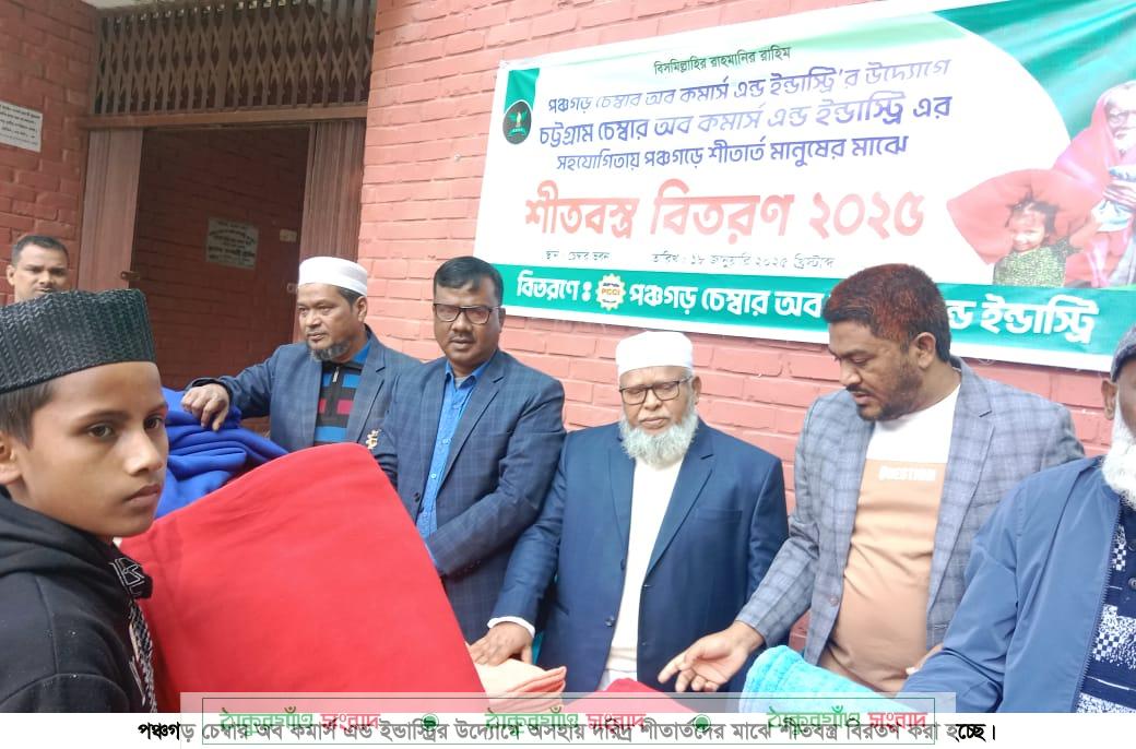 পঞ্চগড় প্রতিনিধি\পঞ্চগড় চেম্বার অব কমার্স এন্ড ইন্ডাস্ট্রির উদ্যোগে পঞ্চগড়ের অসহায় দরিদ্র শীতার্তদের মাঝে শীতবস্ত্র বিতরণ করা হয়েছে। গতকাল শনিবার দুপুরে পঞ্চগড় চেম্বার ভবনে ৮শ জন শীতার্ত মানুষের মাঝে শীতবস্ত্র হিসেবে কম্বল বিতরণ করা হয়। এ সময় পঞ্চগড় চেম্বারের সভাপতি আলহাজ্ব মো. শরিফ হোসেন, সিনিয়র সহ সভাপতি মো. আবু হিরন, সহ সভাপতি আব্দুস সামাদ পুলক ও খলিলুর রহমান, পরিচালক রাওজুল কারিম, রেজাউল করিম রেজা, হায়াতুন আলম, আবু দাউদ প্রধানসহ চেম্বারের পরিচালকগণ উপস্থিত ছিলেন। এ সময় চেম্বারের সভাপতি আলহাজ্ব শরিফ হোসেন বলেন, পঞ্চগড় জেলা শীতপ্রবণ জেলা। জেলা শীতার্ত মানুষের দূর্দশা লাঘবে সামাজিক দায়বদ্ধতার অংশ হিসেবে চেম্বারের উদ্যোগে তাদের মাঝে শীতবস্ত্র বিতরণ করা হচ্ছে।
