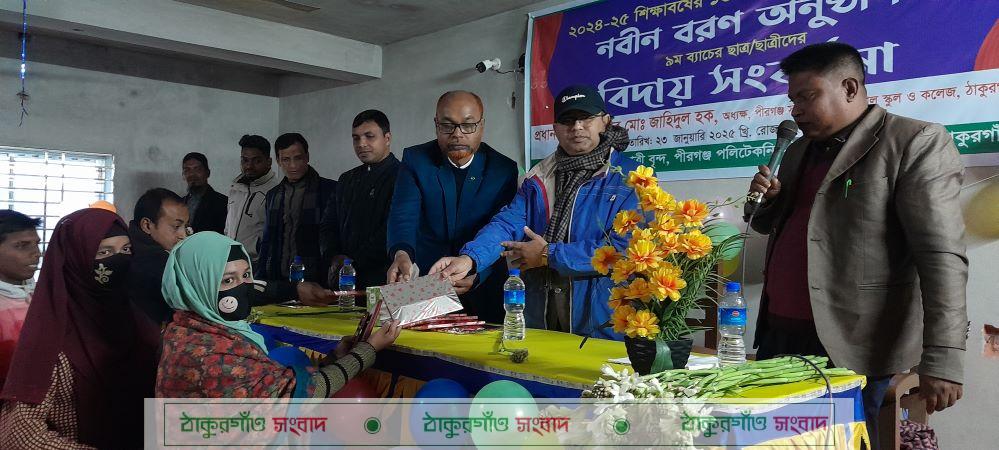 পীরগঞ্জ প্রতিনিধি ঃ ঠাকুরগাঁওয়ে পীরগঞ্জ পলিটেকনিক ইন্সটিটিউট এর ১৩ ব্যাচের শিক্ষার্থীদের নবীন বরণ ও ৯ম ব্যাচের শিক্ষার্থীদের বিদায় সংবর্ধনা এবং সাংস্কৃতিক অনুষ্ঠান হয়েছে। বৃহস্পতিবার দুপুরে ইন্সটিটিউটের নিজস্ব ক্যাম্পাসে আয়োজিত এ আনুষ্ঠানে সভাপতিত্ব করেন পীরগঞ্জ পলিটেকনিক ইন্সটিটিউটের অধ্যক্ষ নুরুল ইসলাম। বক্তব্য দেন, পীরগঞ্জ সরকারী টেকনিক্যাল স্কুল এন্ড কলেজের অধ্যক্ষ জাহিদুল হক, পীরগঞ্জ পলিটেকনিক ইন্সটিটিউট এর সিভিল বিভাগের প্রধান উত্তম কুমার রায়, ইলেকট্রিক্যাল বিভাগের প্রধান ওমর ফারুক, এ্যারেল বিভাগের প্রধান দেলোয়ার হোসেন, ইন্সট্রাক্টর রশিদুল ইসলাম প্রমূখ। এ সময় প্রতিষ্ঠানের অন্যান্য শিক্ষক ও শিক্ষার্থীরা উপস্থিত ছিলেন।