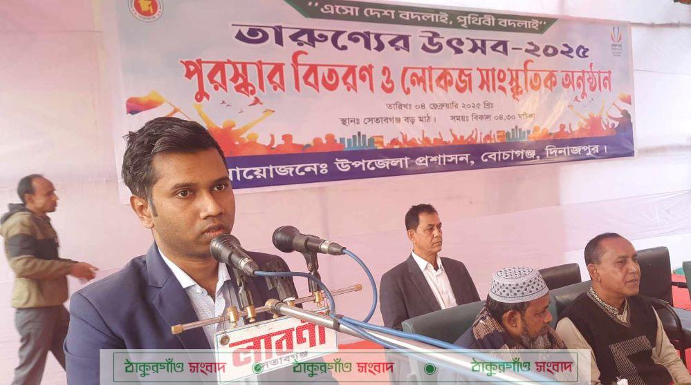 মোঃ শামসুল আলম, বোচাগঞ্জ (দিনাজপুর) প্রতিনিধি\ “এসো দেশ বদলাই, পৃথিবী বদলাই” এই প্রতিপাদ্য বিষয়কে সামনে রেখে দিনাজপুরের বোচাগঞ্জে মঙ্গলবার তারুণ্যের উৎসব-২০২৫ উদযাপন উপলক্ষে সকাল ১১টায় সেতাবগঞ্জ বড়মাঠে দিনব্যাপী লোক ও কারুশিল্প মেলা, পিঠা উৎসব ও জুলাই-৩৬ এর চিত্র প্রদর্শনীর শুভ উদ্বোধন করেন উপজেলা নির্বাহী অফিসার মোঃ মারুফ হাসান। উপজেলা প্রশাসন আয়োজিত এ মেলায় বৈষম্য বিরোধী ছাত্র আন্দোলনের শিক্ষার্থীদের জুলাই-৩৬ এর চিত্র প্রদর্শনী স্টলসহ ৩০টি স্টল অংশ নেয়। মেলায় প্রচুর দর্শক সমাগম ঘটে। মেলা শেষে বিকাল ৫টায় পুরস্কার বিতরণী অনুষ্ঠানে প্রধান অতিথির বক্তব্যে উপজেলা নির্বাহী অফিসার মোঃ মারুফ হাসান বলেন, মানুষ ইতিহাস থেকে শিক্ষা নেয় না। ১৯৭১ সালের মুক্তিযুদ্ধ যে ৩টি কারণে সংগঠিত হয়েছিল সে ৩টি কারণেই কিন্তু জুলাই বিপ্লব সংঘঠিত হয়েছে। মানুষ অর্থনৈতিক, সামাজিক এবং রাজনৈতিক অধিকার থেকে বঞ্চিত হয়েছিল বলেই জুলাই বিপ্লব সংঘঠিত হয়েছে। জুলাই বিপ্লবে প্রত্যেকটি স্তরের মানুষ, ছাত্রজনতা সবাই এক হয়েছিল যেন আমাদের দেশে নতুন সূর্য্য উদিত হয়। আমরা ক্ষমতায় যাওয়ার পর এমন ভাবে ক্ষমতা আড়কে ধরলাম যে মানুষের অধিকারের কথাই ভুলে গেলাম। আমরা এমন বাংলাদেশ চাই না। তারুণ্যের উৎসব এর মুল কথা হচ্ছে আমরা এমন একটি বাংলাদেশ চাই যে বাংলাদেশে আর কোনদিন অন্যায় অবিচার হবে না। স্থানীয় সরকার বিভাগের ইউডিএফ-ইউজিডিপি এস.এম জসীম উদ্দীন এর সঞ্চালনায় এছাড়াও সভায় বোচাগঞ্জ থানার ওসি মোঃ হাসান জাহিদ সরকার, ইউপি চেয়ারম্যান মোঃ শাহান পারভেজ, উপজেলা যুব উন্নয়ন কর্মকর্তা মোঃ মামুন হাসান চৌধুরী, বৈষম্য বিরোধী ছাত্র আন্দোলনের প্রতিনিধি মোঃ ফয়সাল মোস্তাক, জাতীয় নাগরিক কমিটির প্রতিনিধি মোঃ তাফসির হাসান প্রমুখ বক্তব্য রাখেন। এসময় উপজেলা জামায়াতের আমীর মাওলানা মোঃ আমিনুল ইসলাম, সেতাবগঞ্জ প্রেসক্লাবের সদস্য সচিব মোঃ শামসুল আলম, জাতীয় নাগরিক কমিটির প্রতিনিধি মোঃ ইসমাইল হোসেনসহ এলাকার সুধীজন উপস্থিত ছিলেন। সভা শেষে বিভিন্ন প্রতিযোগিতার বিজয়ীদের মাঝে পুরস্কার বিতরণ করেন অনুষ্ঠানের অতিথিবৃন্দ। পুরস্কার বিতরণ শেষে উক্তমঞ্চে মনোজ্ঞ লোকজ সাংস্কৃতিক অনুষ্ঠান পরিবেশন করেন উপজেলা শিল্পকলা একাডেমির শিল্পীবৃন্দ।
