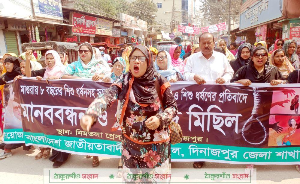 মাগুরায় ৮ বছরের শিশুসহ সারা দেশে নারী ও শিশু ধর্ষণের প্রতিবাদে দিনাজপুরে মানববন্ধন ও প্রতিবাদ মিছিল করেছে জেলা মহিলাদল।
