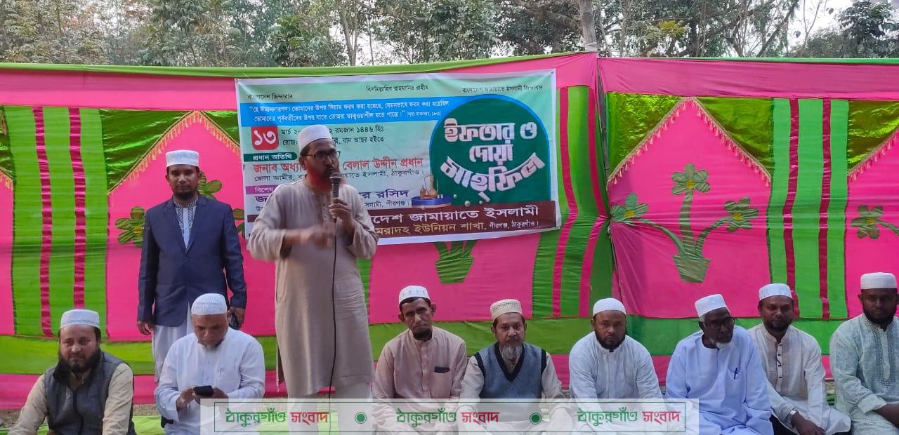আবু তারেক বাঁধন,পীরগঞ্জ (ঠাকুরগাঁও) প্রতিনিধি প্রতিনিধিঃ ঠাকুরগাঁওয়ের পীরগঞ্জে বাংলাদেশ জামায়াতে ইসলামী ভোমরাদহ ইউনিয়ন শাখা’র উদ্যোগে বৃহস্পতিবার (১৩ মার্চ ) মিলন বাজার ফুটবল খেলা মাঠে ইফতার মাহফিল ও রমজানের তাৎপর্য শীর্ষক আলোচনা সভা অনুষ্ঠিত হয়েছে।