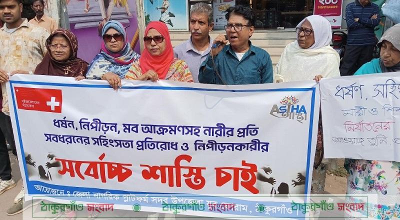 বৃহস্পতিবার দুপুরে ঠাকুরগাঁও চৌরাস্তায় ঘন্টাব্যপি এ মানববন্ধনে বক্তারা সারা দেশের নারীর প্রতি যে সহিংসতা চলছে তার তীব্র প্রতিবাদ জানান। ধষণে নারীর পোষাককে দায়ী করে ধর্ষণকারীদের বৈধতা দেবার ফতোয়া দানকারী দোষীদের আইনের আওতায় আনার দাবী জানানো হয়।