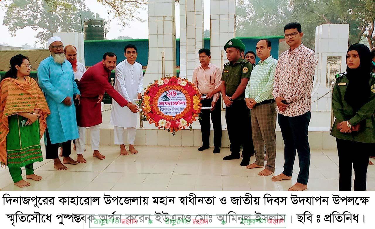 কাহারোল (দিনাজপুর) প্রতিনিধি : দিনাজপুরের কাহারোলে ও সারা দেশের ন্যায় যথাযোগ্য মর্যাদার মধ্য দিয়ে পালিত হলো ৫৫তম মহান স্বাধীনতা ও জাতীয় দিবস। দিবসটি উদযাপন উপলক্ষ্যে উপজেলা প্রশাসন বিভিন্ন কর্মসূচি গ্রহণ করেন। কর্মসূচির মধ্যে ছিলো গতকাল বুধবার সূর্যদ্বয়ের সাথে সাথে ৩১ বার তোপধ্বনির মাধ্যমে মহান স্বাধীনতা ও জাতীয়দিবস এর শুভ সূচনাকরন। উপজেলা পরিষদ চত্বরে অবস্থিত স্মৃতিসৌধের পুষ্পস্তবক অর্পন করেন প্রশাসনের পক্ষ থেকে কাহারোল উপজেলা নির্বাহী অফিসার ও উপজেলা পরিষদের প্রশাসক মোঃ আমিনুল ইসলাম। পরে একে একে উপজেলা বীর মুক্তিযোদ্ধা সংসদ, উপজেলা বিএনপির পক্ষে সভাপতি মোঃ গোলাম মোস্তফা বাদশা ও সাধারণ সম্পাদক প্রভাষক মোঃ শামীম আলীসহ বিএনপি ও তার সহযোগী অঙ্গ সংগঠনের নেতৃবৃন্দ, বিভিন্ন সামাজিক সংগঠনসমূহ, এনজিও এবং কাহারোল সরকারি ডিগ্রী কলেজ, কাহারোল মহিলা ডিগ্রী কলেজ, রামচন্দ্রপুর মডেল পাইলট সরকারি উচ্চ বিদ্যালয়, বিভিন সংগঠন নিজেরা উপজেলা পরিষদ স্মৃতিসৌধে পুষ্পস্তবক অর্পন করেন। সকাল ৯টায় আনুষ্ঠানিকভাবে জাতীয় পতাকা উত্তোলন, পুলিশ, আনসার ও ভিডিপি, ফায়ার সার্ভিস ও সিভিল ডিফেন্স, গ্রাম পুলিশ, রোভার স্কাউট এবং ছাত্র-ছাত্রীদের সমাবেশ ও কুচকাওয়াজ। দিবসটি উপলক্ষ্যে সুধীজন ও বিভিন্ন পেশাজীবিদের নিয়ে এক আলোচনা সভা উপজেলা নির্বাহী অফিসার মোঃ আমিনুল ইসলামের সভাপতিত্বে অনুুষ্ঠিত হয়। উক্ত সভায় বক্তব্য রাখেন, কাহারোল থানার অফিসার ইনচার্জ (ওসি) মোঃ রুহুল আমিন সহ সরকারি কর্মকর্তা বৃন্দ। সকাল সাড়ে ১১ টায় উপজেলা পরিষদ মাঠে প্রীতি ফুটবল প্রতিযোগিতা। এতে অংশগ্রহণ করেন উপজেলা পরিষদ একাদশ বনাম উপজেলা নির্বাহী অফিসার একাদশ, দুপুর ১২ টার দিকে উপজেলা পরিষদ হলরুমে বীরমুক্তিযোদ্ধা ও শহীদ মুক্তিযোদ্ধা পরিবারদের সদস্যগণের সংবর্ধনা ও আলোচনা সভা অনুষ্ঠিত হয়।