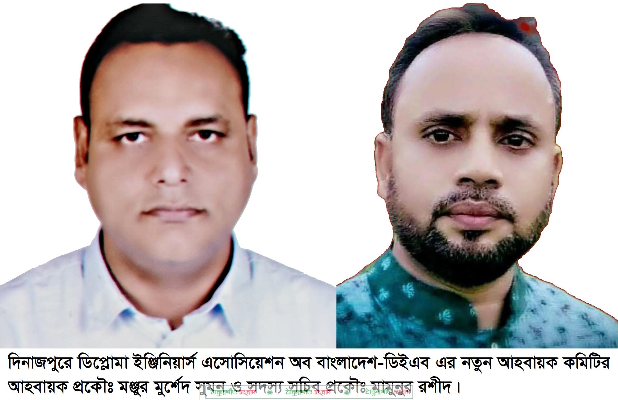 ডিপ্লোমা ইঞ্জিনিয়ার্স এসোসিয়েশন অব বাংলাদেশ-ডিইএব এর কেন্দ্রীয় কমিটির সভাপতি প্রকৌশলী ইবনে ফজল সাইফুজ্জামান ও মহাসচিব প্রকৌশলী কাজী শাখাওয়াত হোসেন স্বাক্ষরিত ২৮ এপ্রিল ২০২৫ ইং এর এক পত্রে ডিইএব দিনাজপুর জেলা শাখার প্রকৌশলী মোঃ মঞ্জুর মুর্শেদ সুমনকে আহবায়ক ও প্রকৌশলী মামুনুর রশীদকে সদস্য সচিব করে ২৪ সদস্য বিশিষ্ট আহবায়ক কমিটির অনুমোদন দিয়েছেন।