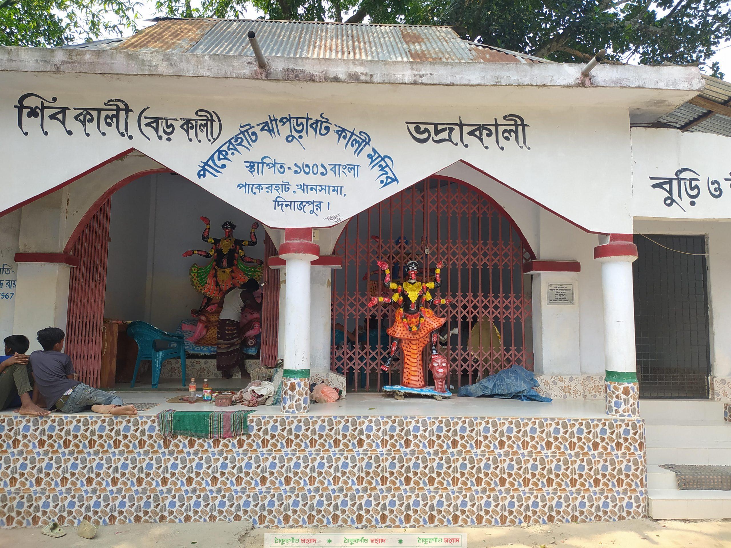 বৃহস্পতিবার দেখা যায়,খানসামা উপজেলার আঙ্গারপাড়া ও গোয়ালডিহি ইউনিয়নের শেষ সিমান্তে পাকেরহাট আদর্শ গ্রামে ১৩০১ বাংলা সালে স্থাপিত ঐতিহ্য বাহী এই প্রতিষ্ঠানটিতে ২জন মৃৎশিল্পী দিনব্যাপী কাজ করে গড়ে তুলছেন শিব কালী (বড় কালী),ভদ্রাকালী,বুড়ি ও শীতলা দেবী,মাশান ও শ্মশান কালী প্রতিমা।প্রতিমাগুলো ঘষামাজা কাজ শেষ,চলছে রং-তুলির আঁচড়ে রাঙিয়ে তোলার কাজ।তাদের সুনিপুণ কারুকাজে যেন প্রাণবন্ত হয়ে উঠেছে প্রতিমাগুলো।